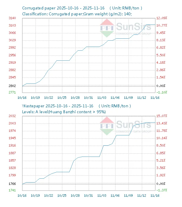 A 140 g/m²-es hullámpapír ára 12,09%-kal nőtt 2025. október 16. és november 16. között. Hosszabb időszakban (augusztus 27. és november 25. között) a kumulált nyereség elérte a 20,99%-ot. November 24-re a legutóbbi ár elérte a 3170 RMB tonnánként, kis felfelé korrekciókkal.